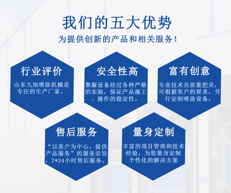 山東九旭機(jī)械科技有限公司歷經(jīng)十幾年的發(fā)展,已成長為液壓聚脲設(shè)備行業(yè)頗具實(shí)力的設(shè)備制造業(yè)之一。主要產(chǎn)品:聚氨酯高壓噴涂機(jī)、聚氨酯高壓發(fā)泡機(jī)、液壓聚脲噴涂設(shè)備及設(shè)備配件(聚氨酯高壓噴槍、槍嘴、加熱管道、料塊、摩擦副、增壓泵、混合式、提料泵等)也是堅(jiān)持最好的質(zhì)量服務(wù)用戶,